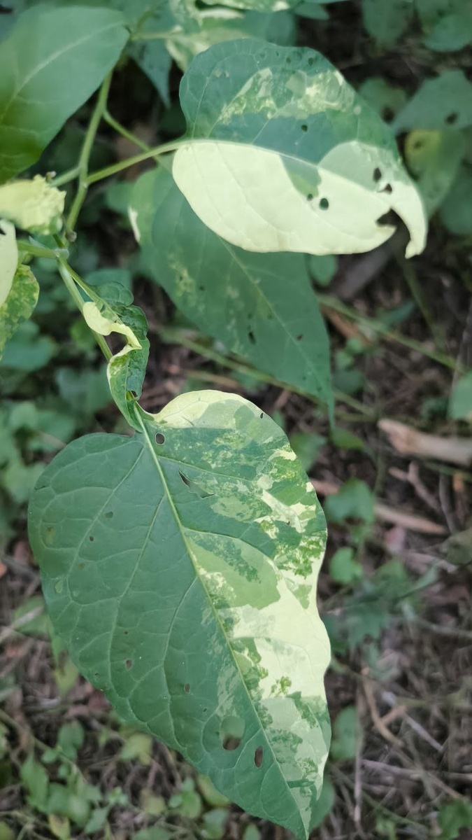 На фото: случайно выявленная хлорофильная мутация у растения паслёна сладко-горького, запечатленная в парке.