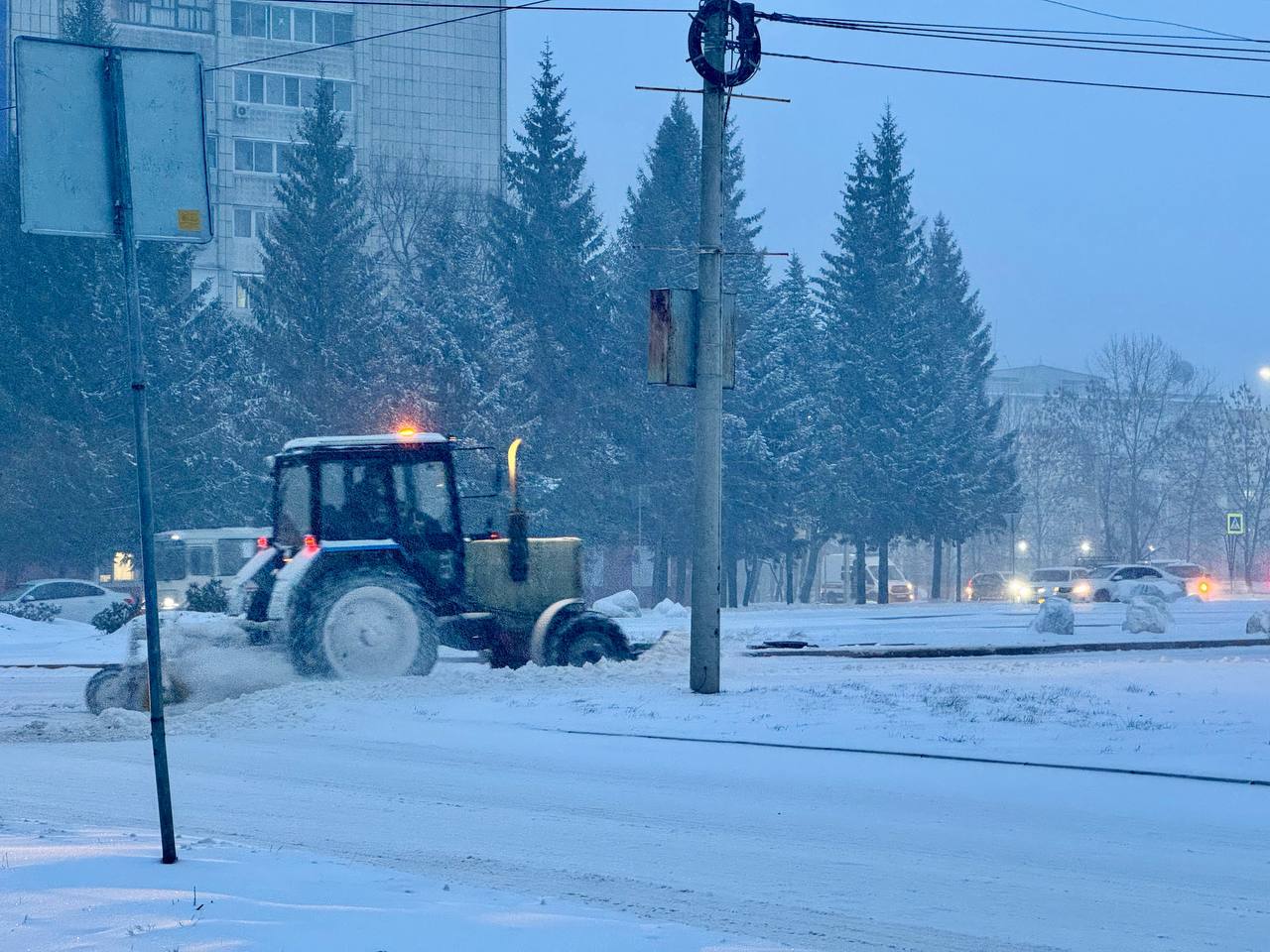 В областной центр пришёл мощный снегопад, и коммунальные службы уже в полном режиме работают на уборке города. На дорогах работают машины МТЗ и КДМ, очищая проезжую часть от снега.