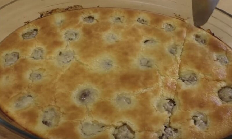 Заливаем фрикадельки приготовленным тестом и помещаем форму в разогретую до 150 градусов духовку на 40 минут. Выпекаем до золотистой корочки.