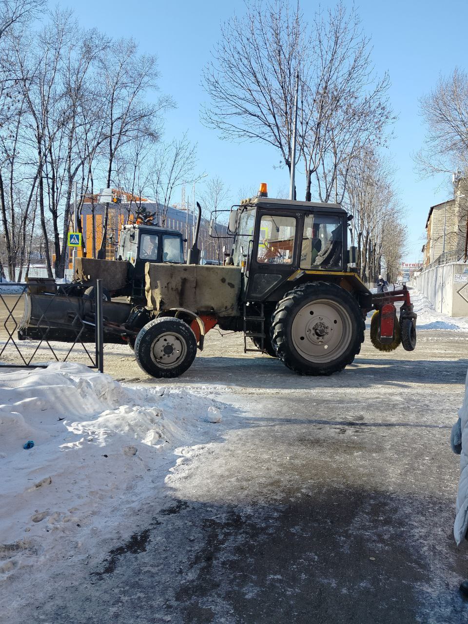 Сегодня снегоуборочная техника задействована в очистке дорог и пешеходных зон, ведущих к социально значимым учреждениям (школам, детским садам).