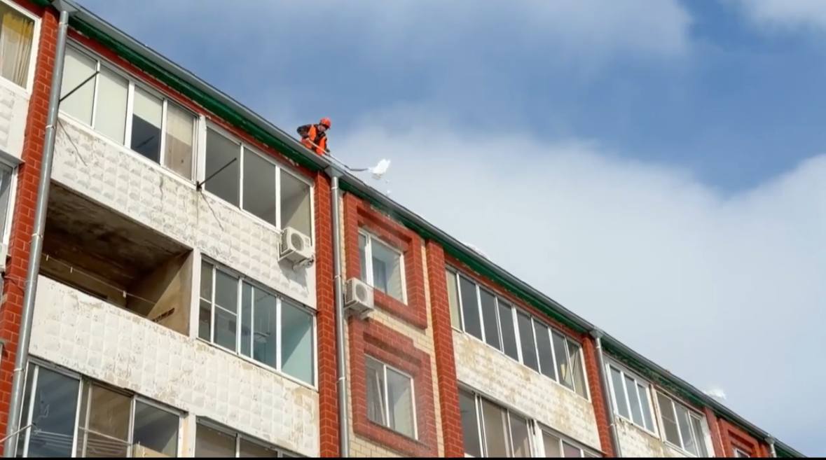Коммунальщики очищают крыши от снега и наледи после циклона в Биробиджане