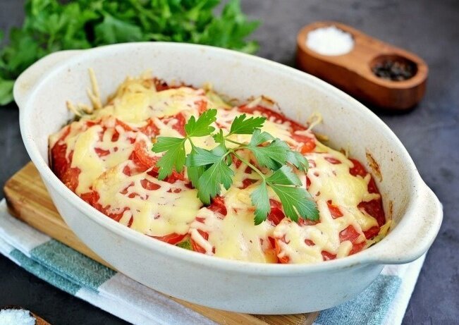 На завершающий слой уложите свежие помидоры, нарезанные кружочками, добавьте перец, чеснок и сыр. Можно не солить помидоры, так как они имеют достаточно естественной соли.