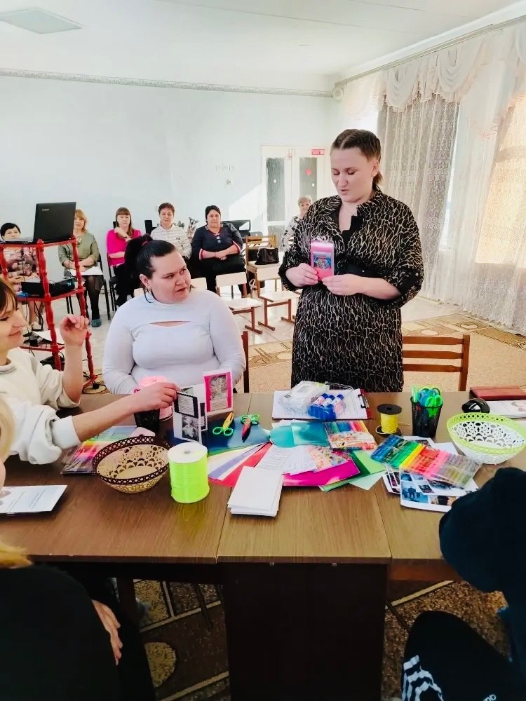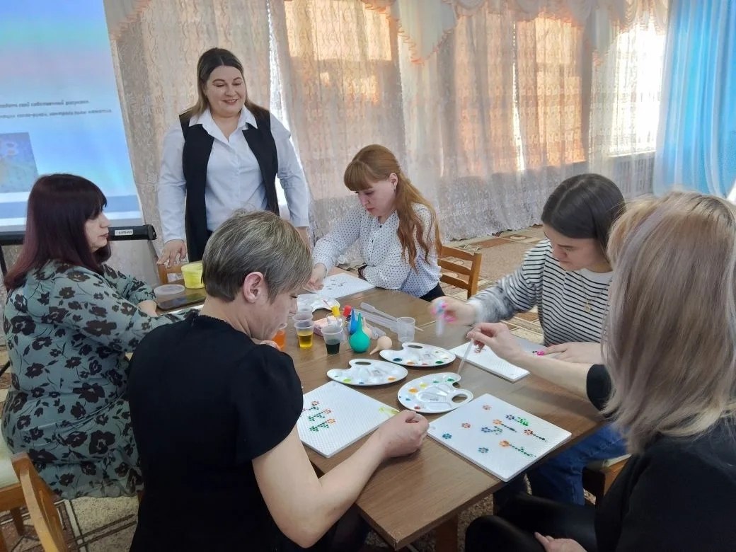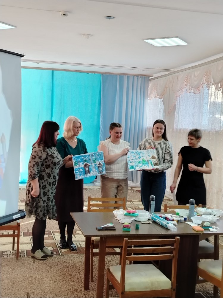 Елена Карепова удивила детей экспериментом с «извержением вулкана», Ольга Грищенко познакомила коллег с техникой мозаичного рисования, а Дарья Улькина показала, как создать семейную книжку-раскладушку.