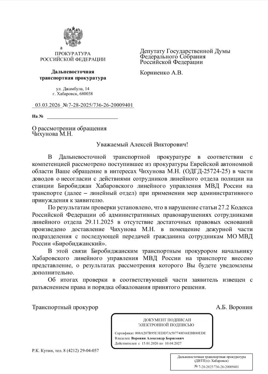 Согласно ответа Прокурора, моё задержание в г. Биробиджане было безосновательно и не законно. Интересно, сотрудники полиции понесут наказание? Конечно же нет, в России живём. Жаль конечно. Вот так и выходит, приехал в другой город, а тебя прям с поезда в казематы... Просто потому, что ты коммунист
