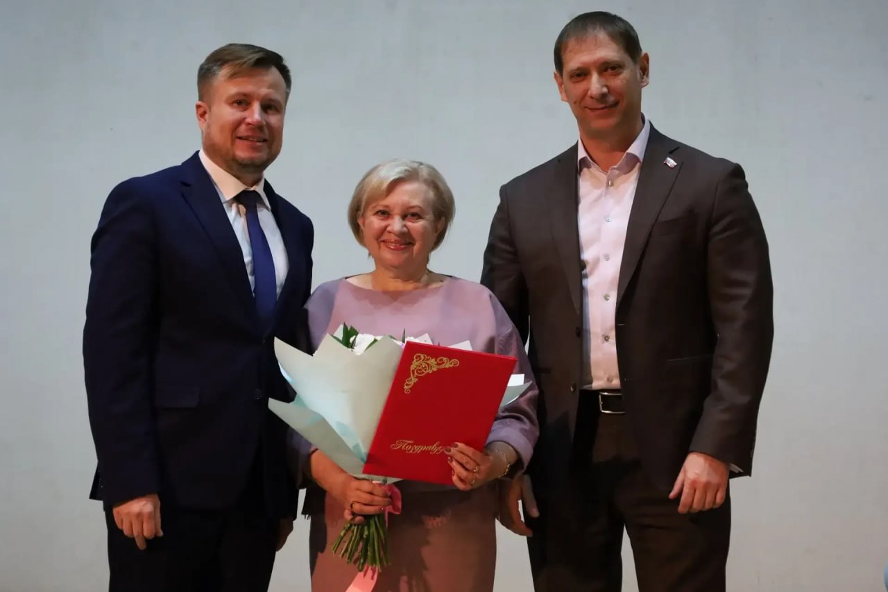 Заместитель председателя Городской Думы Биробиджана Сергей Бурындин и заместитель главы мэрии города Андрей Михайлов поздравили с юбилеем директора Центра детского творчества, почётного жителя города Марию Анатольевну Шульман.