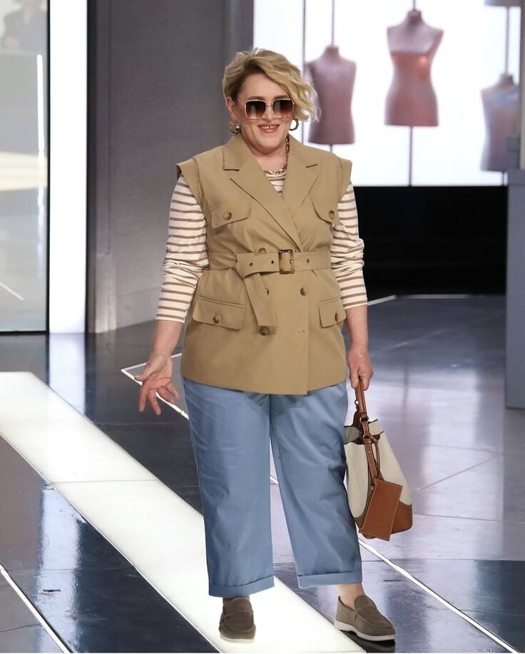 - Современный ансамбль: светло-голубые джинсы, подвернутые на щиколотках, и бежевый лонгслив с горизонтальными полосами идеально сочетаются с кофейно-бежевым жилетом, напоминающим пальто без рукавов. Такой наряд визуально уравновесит фигуру благодаря крою и широкому поясу.