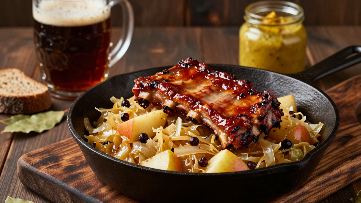 В недрах чугунной сковороды томится капуста, которая не имеет ничего общего с консервированной. Она нежная и слегка кислая, с яркими нотами яблок и можжевельника. В сочетании с мягкими копчёными рёбрышками это блюдо становится настоящим кулинарным откровением, полным осеннего уюта.