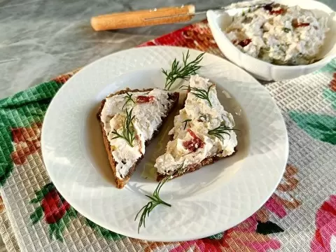 В глубокой миске соединяют творог со сметаной, добавляют соль, сахар и перец по вкусу. Постепенно вводят вяленые томаты, предварительно нарезанные, каперсы и горчицу. Все тщательно перемешивается до получения однородной массы.