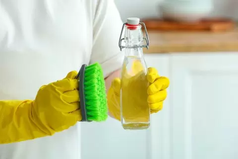 - Белый уксус: Этот секретный ингредиент является высокоэффективным средством для чистки. Для его использования нужно смешать равные части уксуса и теплой воды. Полученный раствор распыляется на плитку и оставляется на 15 минут. После этого остатки загрязнений можно легко удалить с помощью губки или тряпки. Важно помнить о том, что уксус не подходит для мраморных и каменных поверхностей, поскольку его кислотность может их повредить.