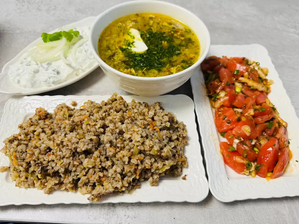 Обед оказался не менее разнообразным: щи со щавелем, ароматная печенка с гречкой и блины с творогом стали основными блюдами. Для тех, кто любит сладости, компоты, кефир и кофе стали отличными дополнениями.