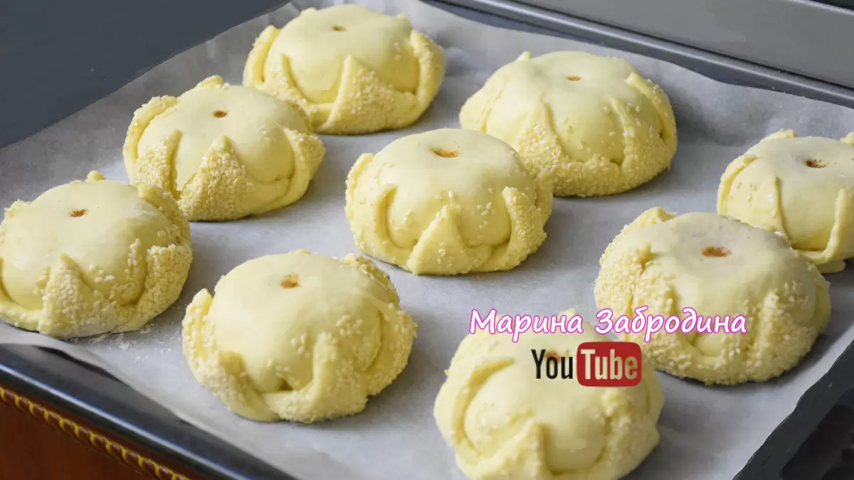 Когда тесто подошло, его обминают и делят на две части, одна из которых должна быть больше другой. Каждую часть раскатывают, добавляют начинку и формируют булочки. Со стороны можно украсить их треугольничками из оставшегося теста, которые прикрепляются к основному изделию. Булочки перекладываются на противень, накрываются пленкой и оставляются на расстойку на 40 минут, после чего смазываются яйцом и выпекаются в разогретой духовке при 180 градусах около 15-20 минут.