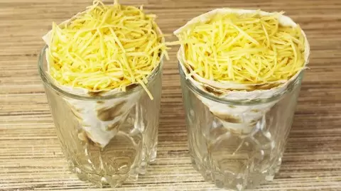 Начать стоит с подготовки лаваша. Лист разрезать пополам и каждую половину свернуть в аккуратный кулечек. Для надежности закрепите края зубочистками, чтобы они не раскрылись в процессе. Настоятельно рекомендуется ставить рожки в стаканы – это поможет сохранить их форму.