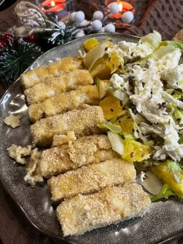Секрет удачного блюда — минимальный набор ингредиентов и понятная технология: филе нарезать длинными палочками, обмакнуть в яйце и панировочных сухарях, запечь до хрустящей золотистости.