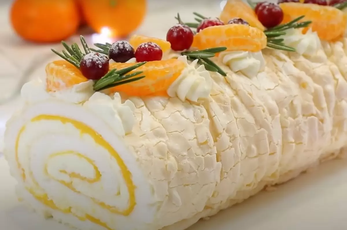 Мандариновый меренговый рулет — это не просто десерт, это настоящая симфония вкусов, которая совмещает в себе хрустящую меренгу, нежный крем и освежающие цитрусовые нотки. Этот эффектный сладкий шедевр мгновенно привлекает взгляды на праздничном столе. Его снежно-белая текстура, дополненная ярким мандариновым кремом и свежими фруктами, станет заключительным аккордом любого угощения.