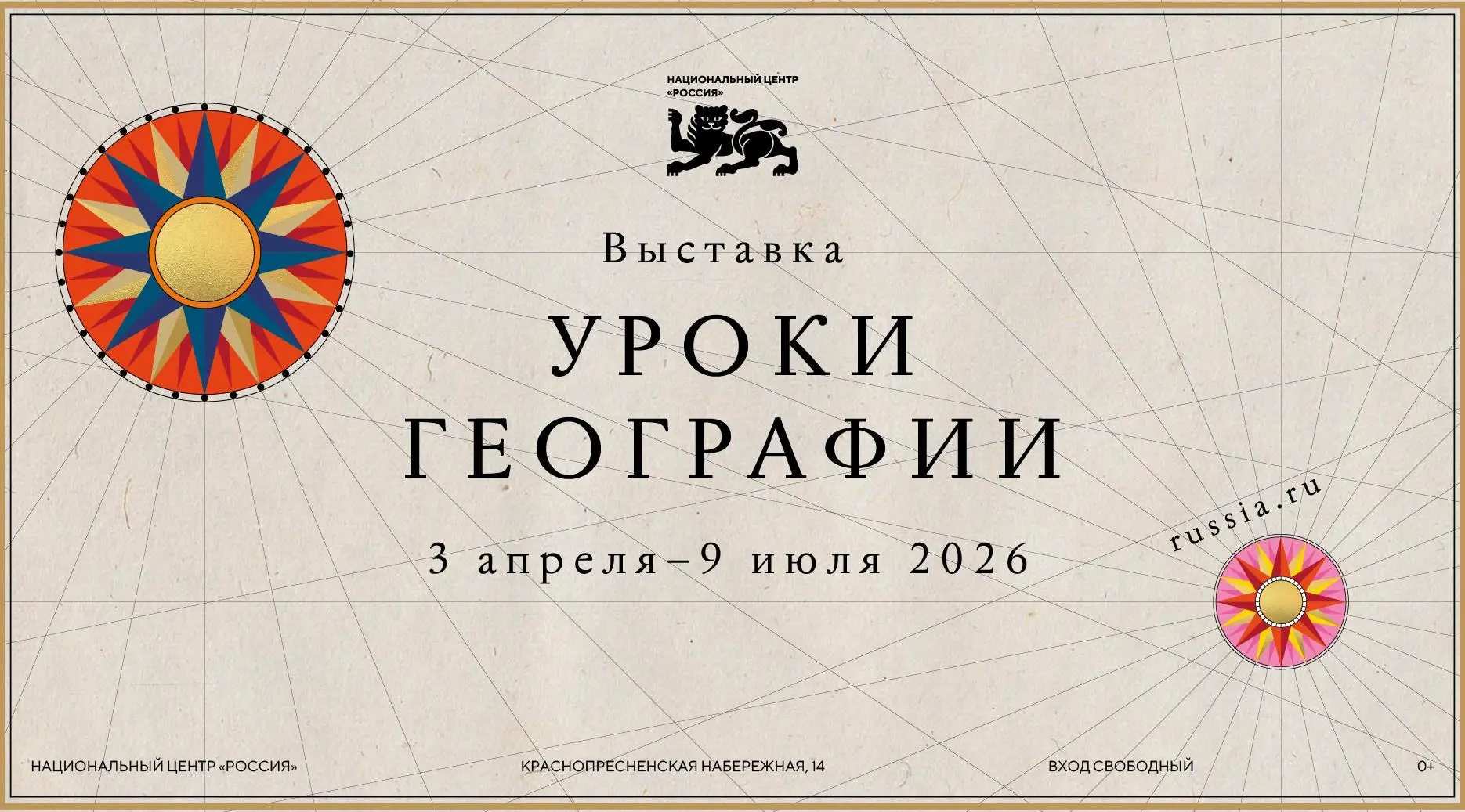 Выставка «Уроки географии» будет открыта для посетителей по 5 июля 2026 года в выставочном зале Национального центра «Россия» (Москва, Краснопресненская наб., 14), а также в филиалах центра.